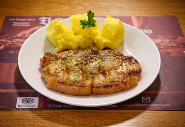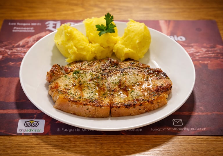 Cerdo cocido a la parrilla, acompañado de puré suave que complementa su sabor.