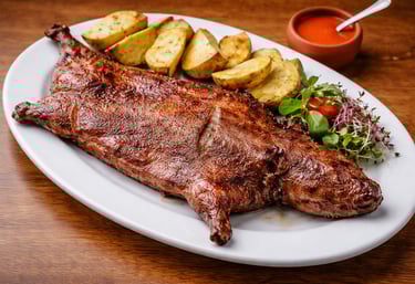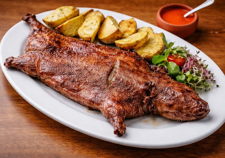 Cerdo a la brasa servido con papa andina, resaltando sabores tradicionales.