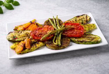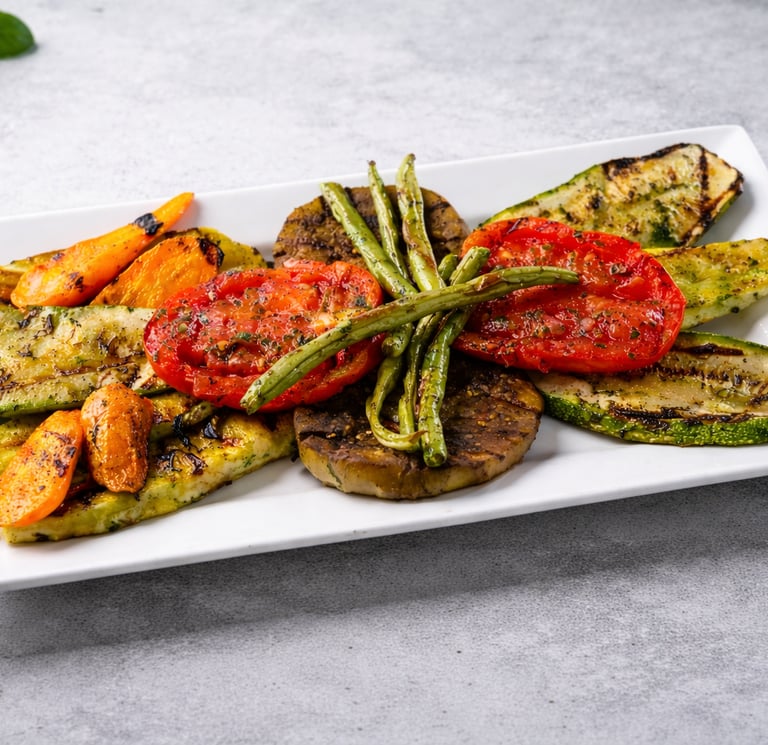 Vegetales seleccionados cocidos a la parrilla, acompañamiento ideal para carnes al fuego.
