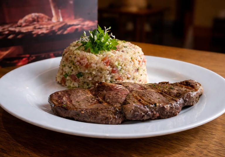 Cordero preparado al fuego, acompañado de quinua para un equilibrio entre tradición andina y parrilla.