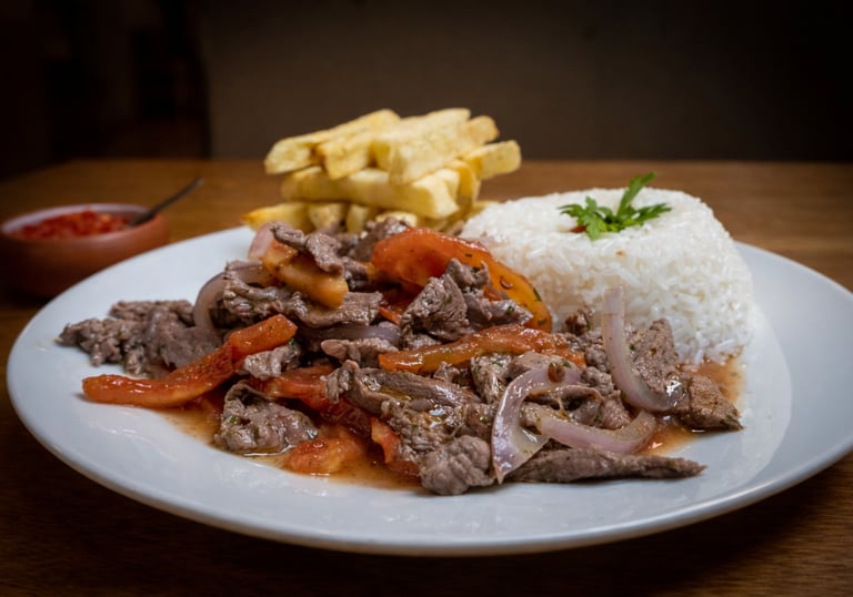Clásico peruano preparado con carne salteada al punto, acompañado de ingredientes frescos.